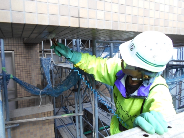 いつも当大規模修繕工事にご協力いただきありがとうございます。現場はここ最近の暑さで蒸しかえるようですが、作業員一同がんばっております。工事は今、廊下階段で塗装工事・各所防水工事・外部ではタイル美装工事が進行しております。足場解体へ向け精一杯工事を進めてまいります。もうしばらくご辛抱ください。