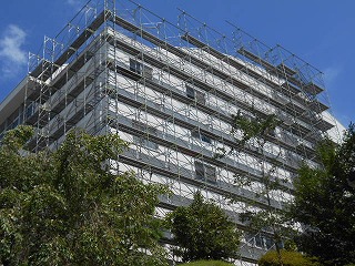 7/22日より足場組立が始まり東面、北面が組みあがり西面、南面へと進めてまいります。学校は夏休み期間ですが、部活動で登校してくる学生さんもたくさんいますので事故のないよう安全第一で進めております。