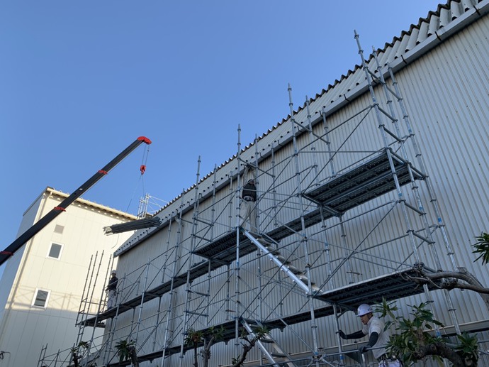 本日より足場の架設工事がはじまりました。冷蔵倉庫の工事のため、平日はフォークリフトの運行が多く、土日祝での作業となります。休日でもフォークリフトの運行があるため、施設担当者様と打合せを行い、作業の際は十分注意をして足場の組立を行います。工事は3月中旬までを予定しております。竣工まで何卒宜しくお願い致します。