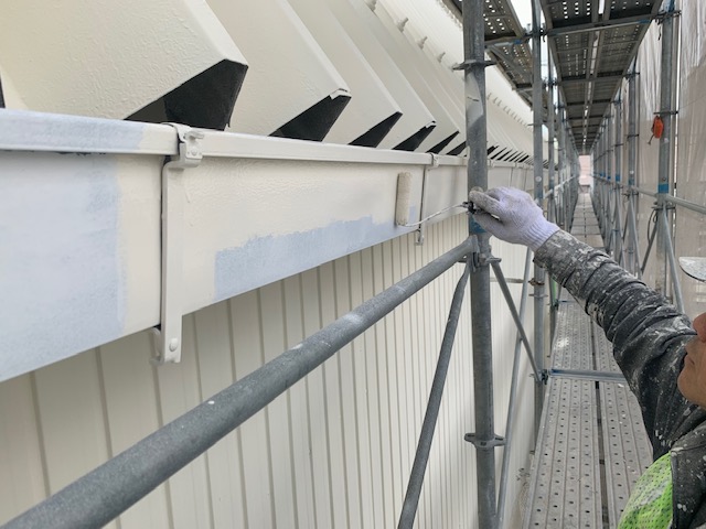 さて、本日は台風の影響で傷んだ軒樋を新たに更新した部分の塗装工事を行っております。屋根・外壁と同色で丁寧にローラー塗りを行い、仕上げていきます。