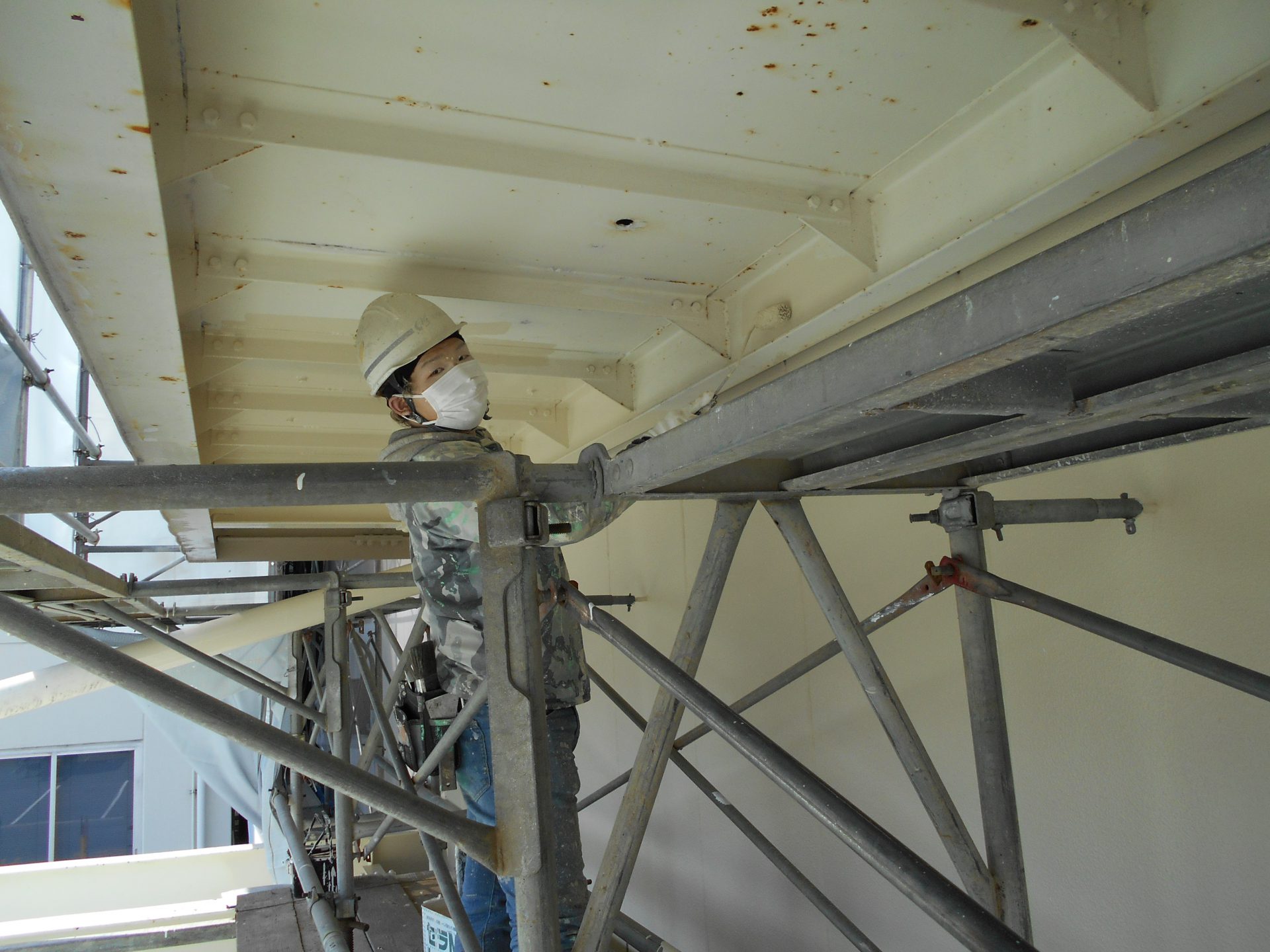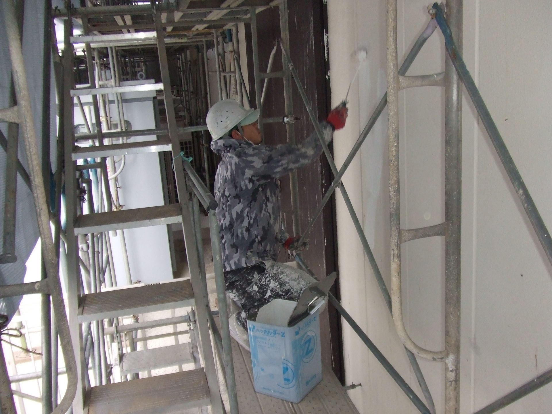 18日に「塗装工事」に着手しました。西面の外部鉄骨階段を含む鋼製建具の、ケレン~錆止め塗装を施しながら、外壁ALC面の下塗り~中塗りの工事中です。