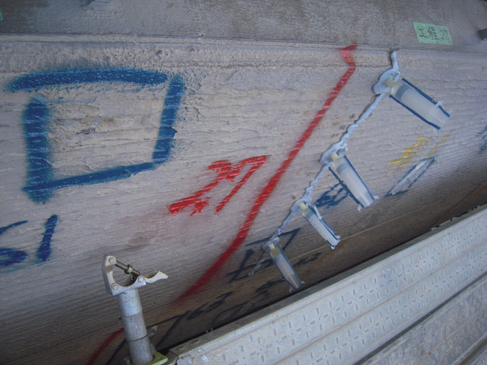 そこで、写真のように注射器のような器具を用いてコンクリート面のひび割れ部に修復剤をゆっくり流し込み補修していきます。このように圧力をあまりかけないでひび割れ部に接着剤を注入する方法を低圧注入工法といいます。 -