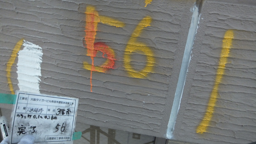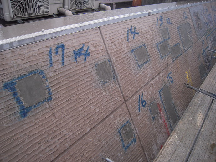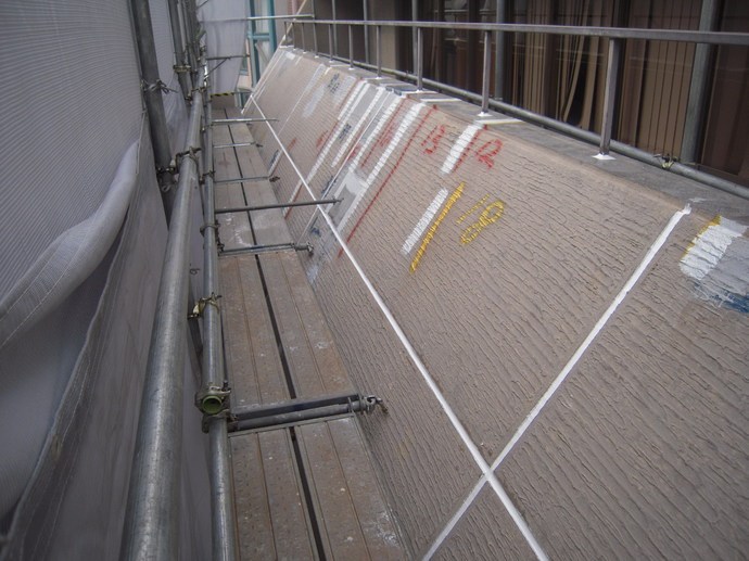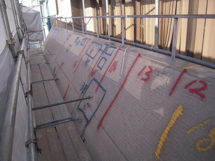 連日厳しい寒さが続き、雪もちらつく日もありますが、1/25(木)には、写真のように補修が必要な劣化箇所を南面外壁面全面にて調査し、補修種別に応じたマーキング(表示)を行いました。