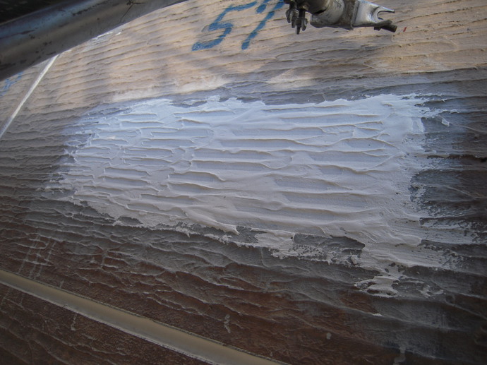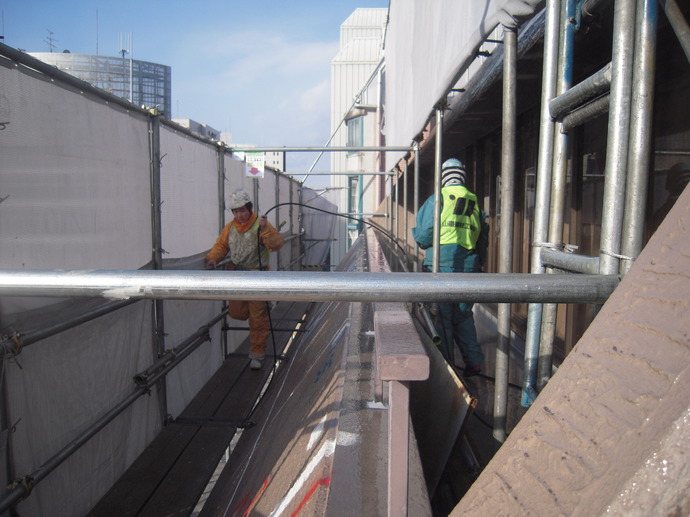撮影日は雪がちらついており、全体的に白くなっておりますが、写真は、既存の塗装材が下地から剥離して、下地との間に隙間が生じている箇所の補修中の状況です。