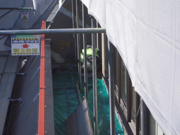 午後からは、塗装を行わない部分に塗料等が付着しないようにビニールシート等で覆う養生を上階から設置していきました。