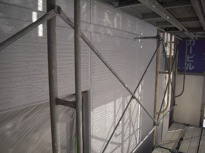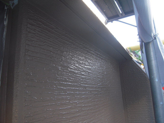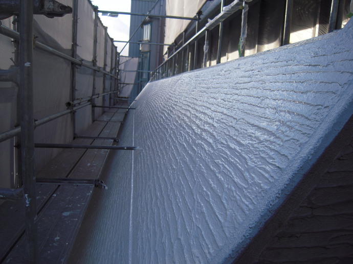 壁面には、凹凸模様が施されており、1回の塗布だけで塗布量を一様にする事は困難で、凹部の奥まで十分に塗料が行き届かない場合があります。この塗布量不足を補うため、全面にもう一度仕上塗装を施します。