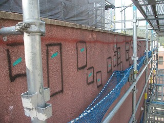 昨日、足場の組立作業が完了し、タイル補修工事、躯体補修工事に入っております。写真は外壁の調査を行い補修部分をマーキングしているところです。夏が戻ってきたような気温になっています。水分補給をしっかり行い、安全第一で工事を進めてまいります。