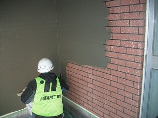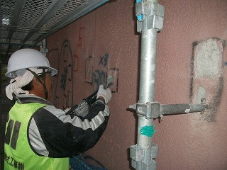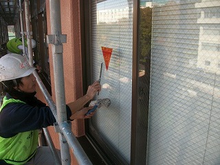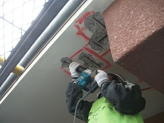 先週から続いています秋雨のために思うように工事が進んでおりません。写真は既存塗膜の浮き部を撤去しているところです。通常ですと手作業でいけますが、ここの塗膜は堅いうえに厚みがある為電動工具を使っての作業となっています。合わせてタイル補修、シーリング打替えを行っています。