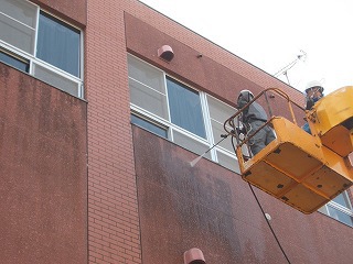 写真は11月23日の記念式典に向け、先行して5号館・2号館の外壁高圧洗浄を高所作業車を使用し行っているところです。現在進行中の1号館の改修工事は外壁塗装工事が完了し、残りは手直し、美装工事と進めまして来週より足場の解体に入る予定です。