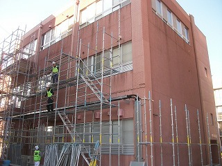 1号館の改修工事が完了し、今週より5号館と2号館の改修工事に入りました。5号館の足場組立完了後、2号館の足場工事に移ります。学生さんが通行しますので安全には十分注意を払い進めてまいります。
