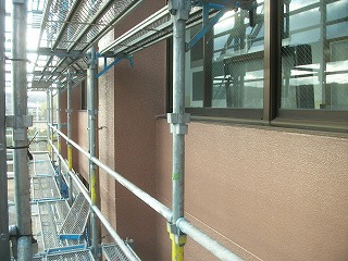 2号館の足場も組み上がり、下地補修工事とシーリング工事に入っております。5号館ではタイル調塗装面の樹脂モルタルしごきを行っています。目地をつぶして平らにし塗装を行います。今週に入り一段と寒くなりました。朝はためている水の表面が凍っています。年末に向け風邪をひかないよう全員で体調管理を行ってまいりたいと思います。