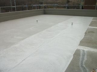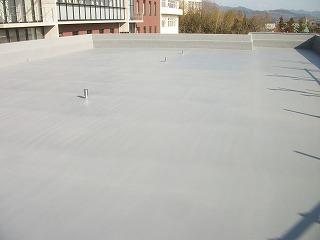 足場の解体が終わり、現在は足場で施工できなかった2号館の庇と西面屋上の防水工事中です。写真は2号館屋上の塗膜防水完了の写真です。今の時期屋上には氷が張るような厳しい条件ですがあせらず、最後まで無事故で終えたいと思っております。