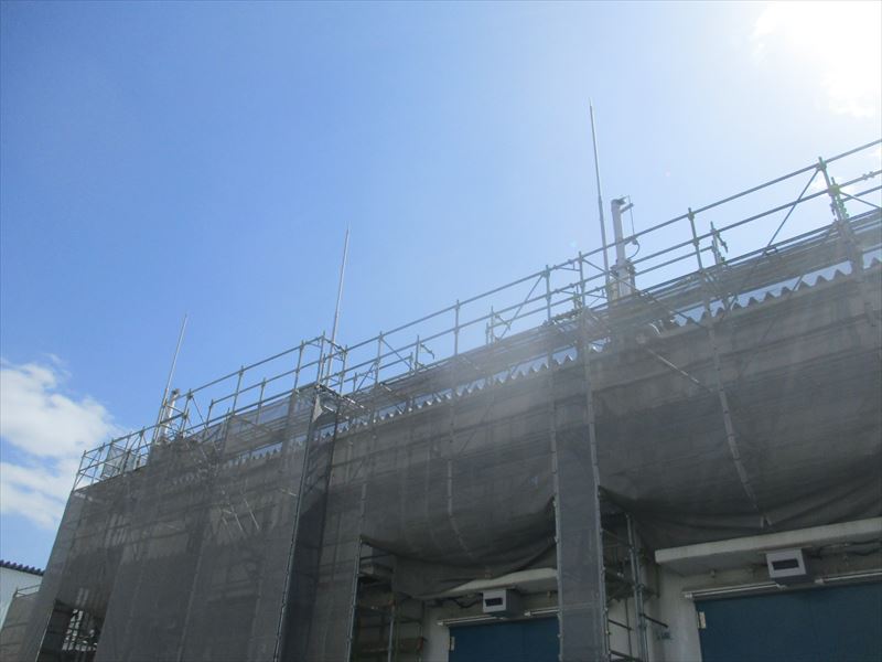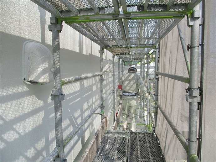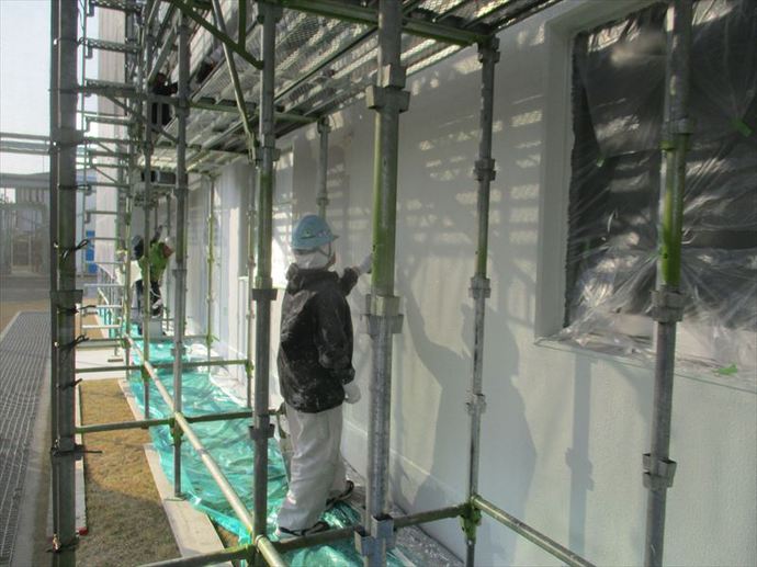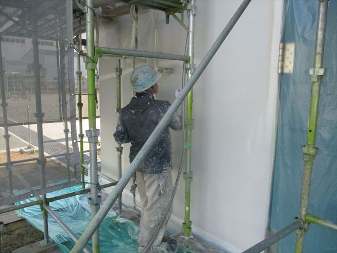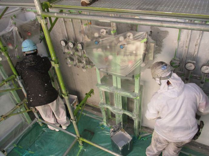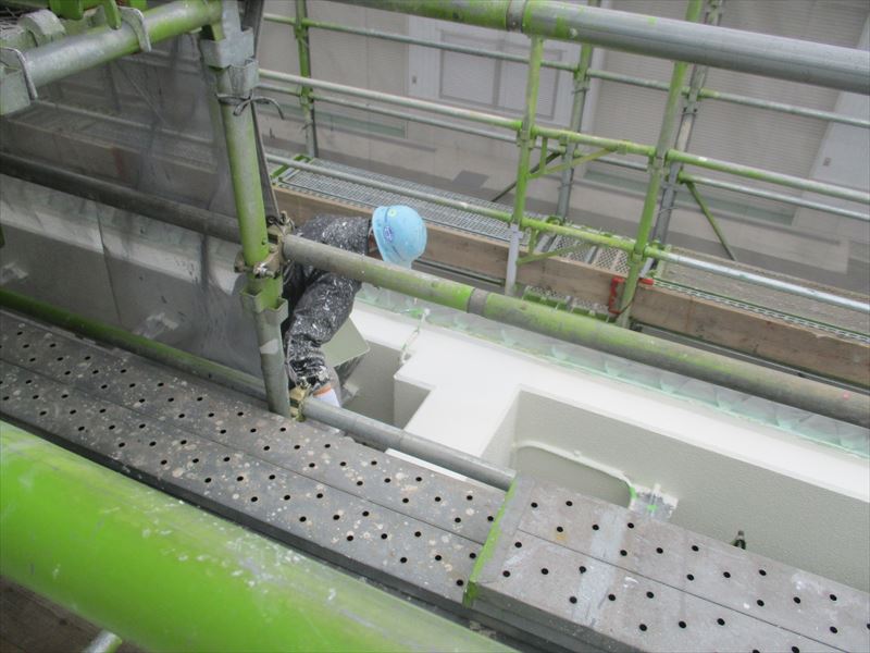 その為しっかりと養生を行い飛散に注意する必要がありますが、塗料の乾きを良くしてくれるというメリットがあります。それに加えてここ数日で気温が上がってきてくれているので、合計6回塗布する工法の工程間隔を短縮することができ、工期全体の短縮に繋がっています。