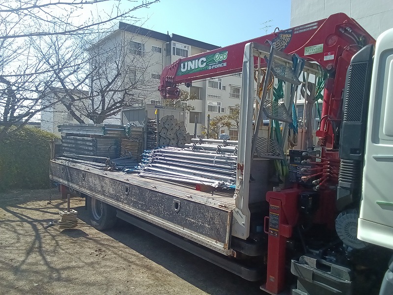 12 足場解体 2025年7月15日 酷暑の中、いよいよ今日から足場の解体作業も開始されました。3カ月以上に渡る工期の改修工事も完了に近づいています。安全第一で完了を目指します。