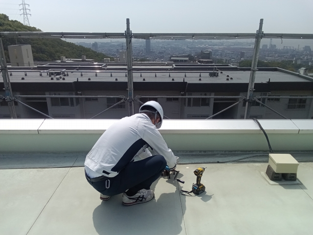 05 アンカー強度試験 2025年5月01日 5月になりました。五月晴れの気持ちの良い青空のもと、本日は屋上塩ビシートのアンカー固定強度試験をおこないました。結果は問題ありません。大型連休明けには防水準備にはいります。天候が安定する事を願うばかりです。