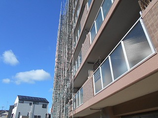 南面の足場が組みあがり、現在北面を進めています。本日より南面外壁の調査及びマーキング作業を行っています。バルコニー内にも入るため洗濯物の制限もありご不便をおかけしております。また1工区ではシーリング工事も進めてまいります。ご協力の程よろしくお願いいたします。