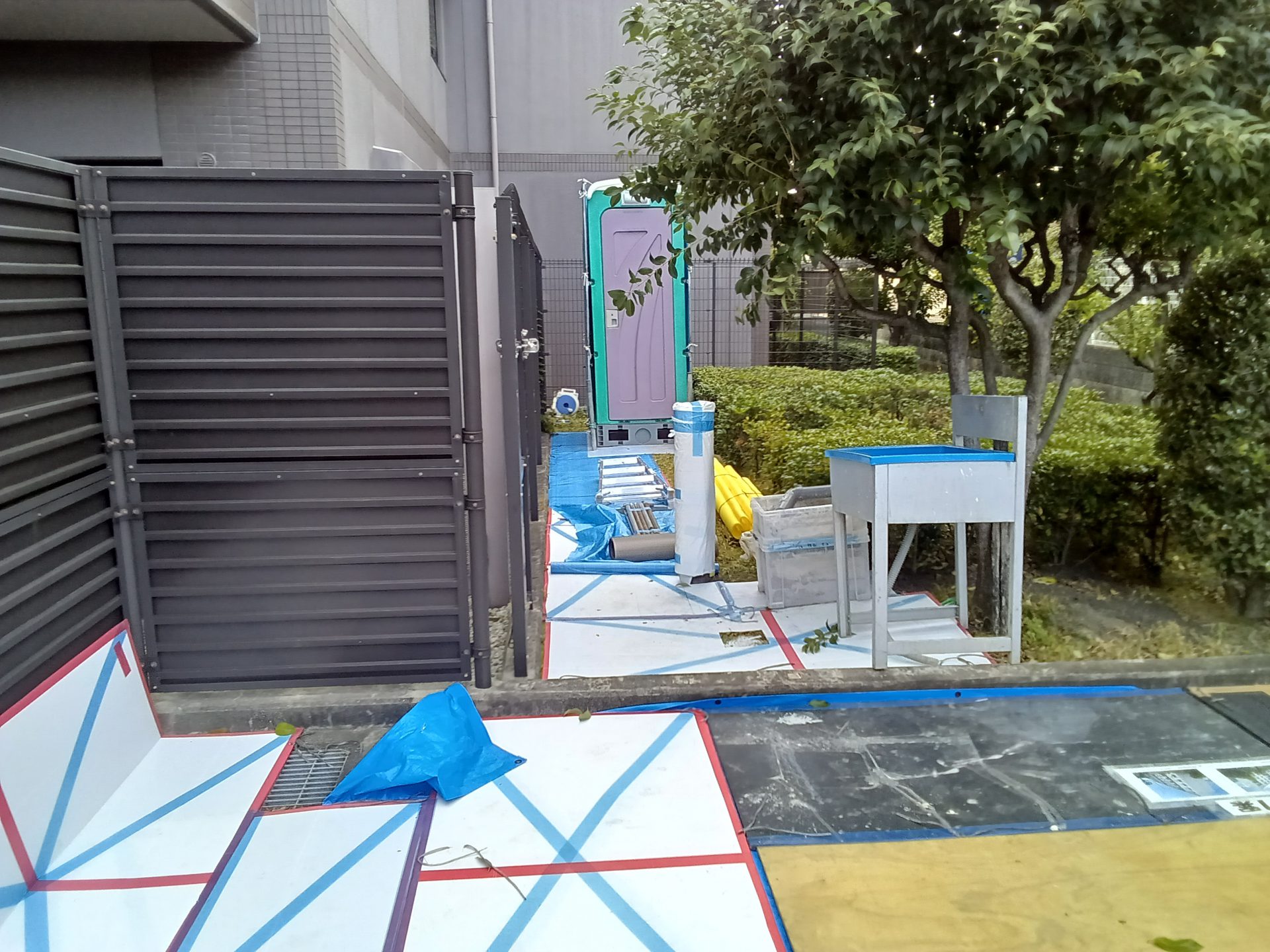 歩行者に安全誘導で、西側から順番に施工中です。 -
