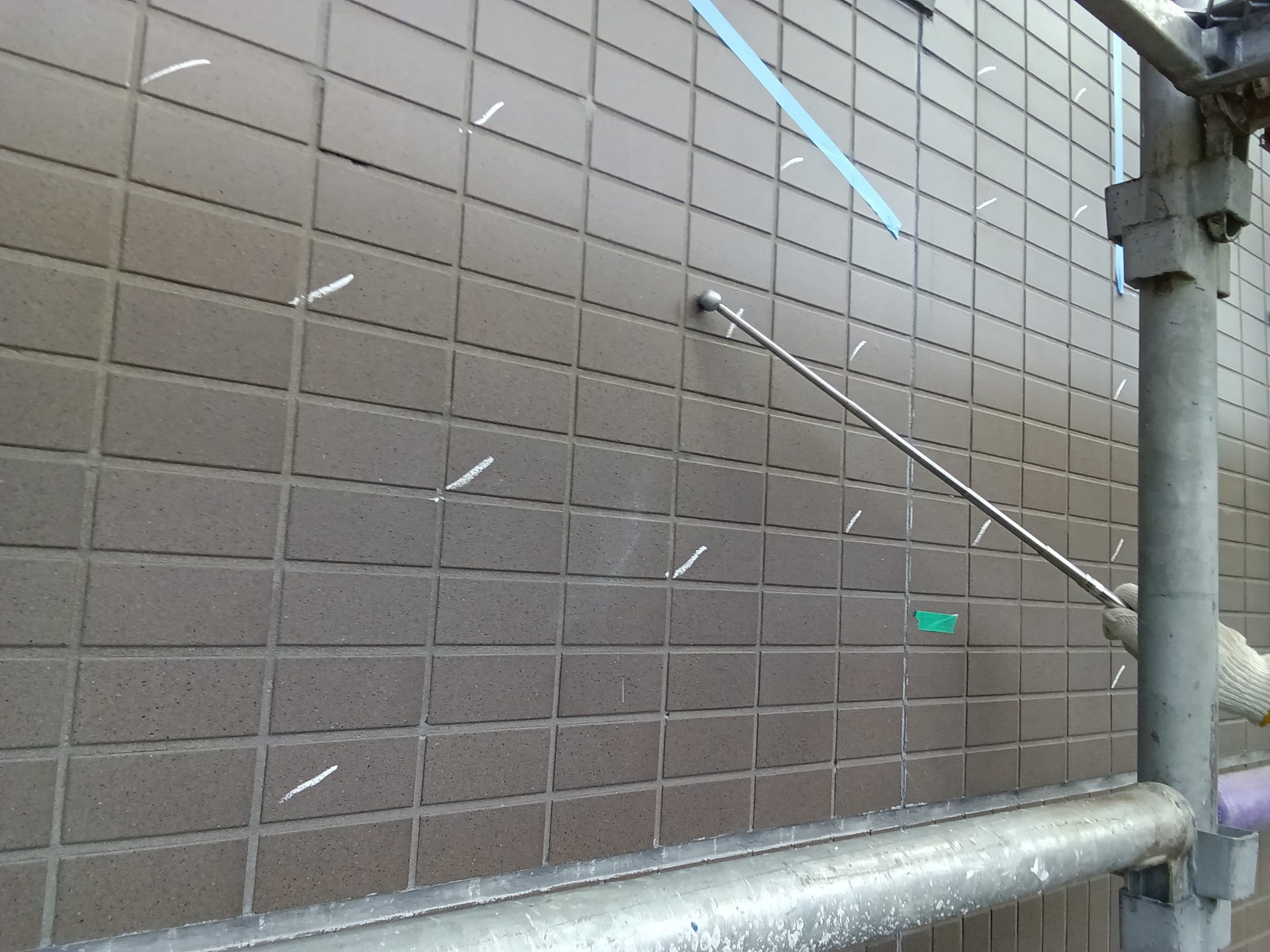タイルの浮き箇所・モルタル下地の不具合をチェックしていきます。 -